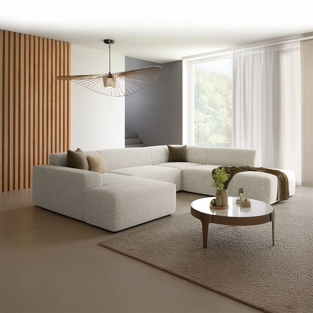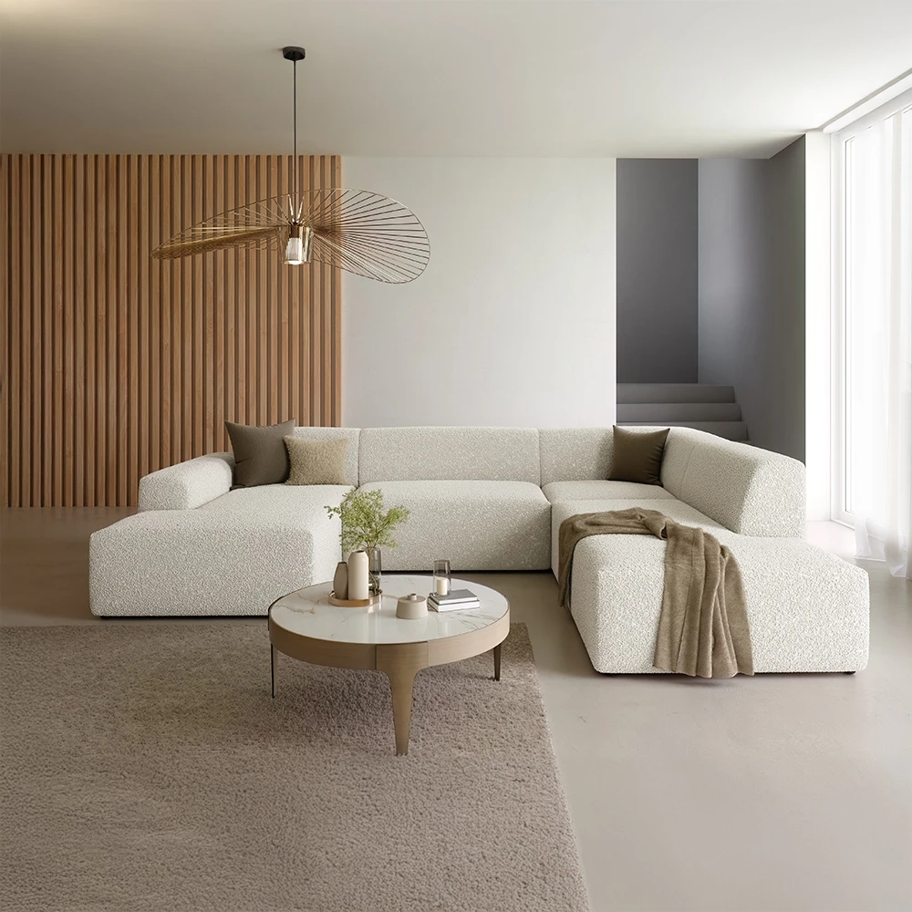 Canapé panoramique d'angle droit en laine bouclée écrue : design moderne et confort enveloppant pour un salon élégant.