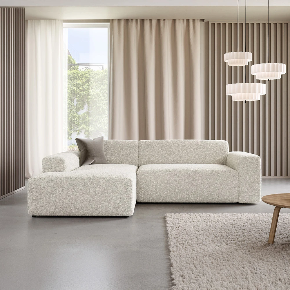 Canapé d'angle en laine bouclée écrue : confort moderne et design élégant pour un salon accueillant.
