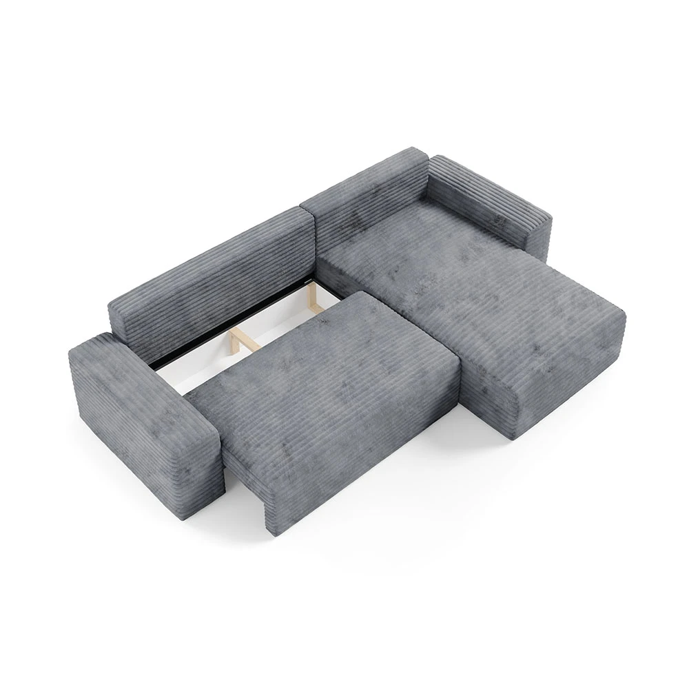 Avec son revêtement en velours côtelé doux et résistant, ce canapé offre une texture riche et une allure élégante qui s'adapte parfaitement à tout style de décoration. Sa teinte apaisante crée une ambiance accueillante et ajoute de la profondeur à votre espace. Conçu pour un confort optimal, ce canapé d'angle offre une assise spacieuse, un dossier moelleux et se transforme aisément en couchage d'appoint pour accueillir vos invités en toute simplicité.