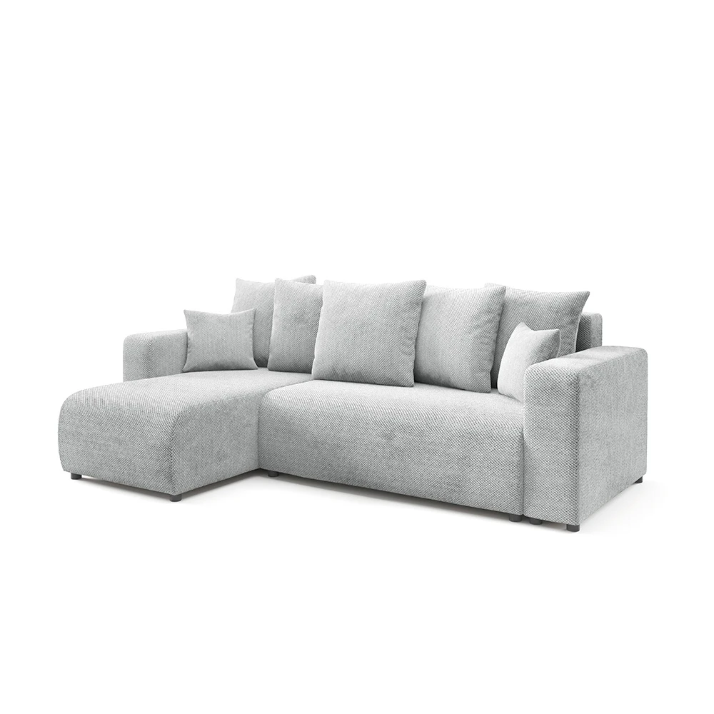 Canapé d'angle en tissu gris clair : design épuré, méridienne confortable et adaptable à tous les intérieurs