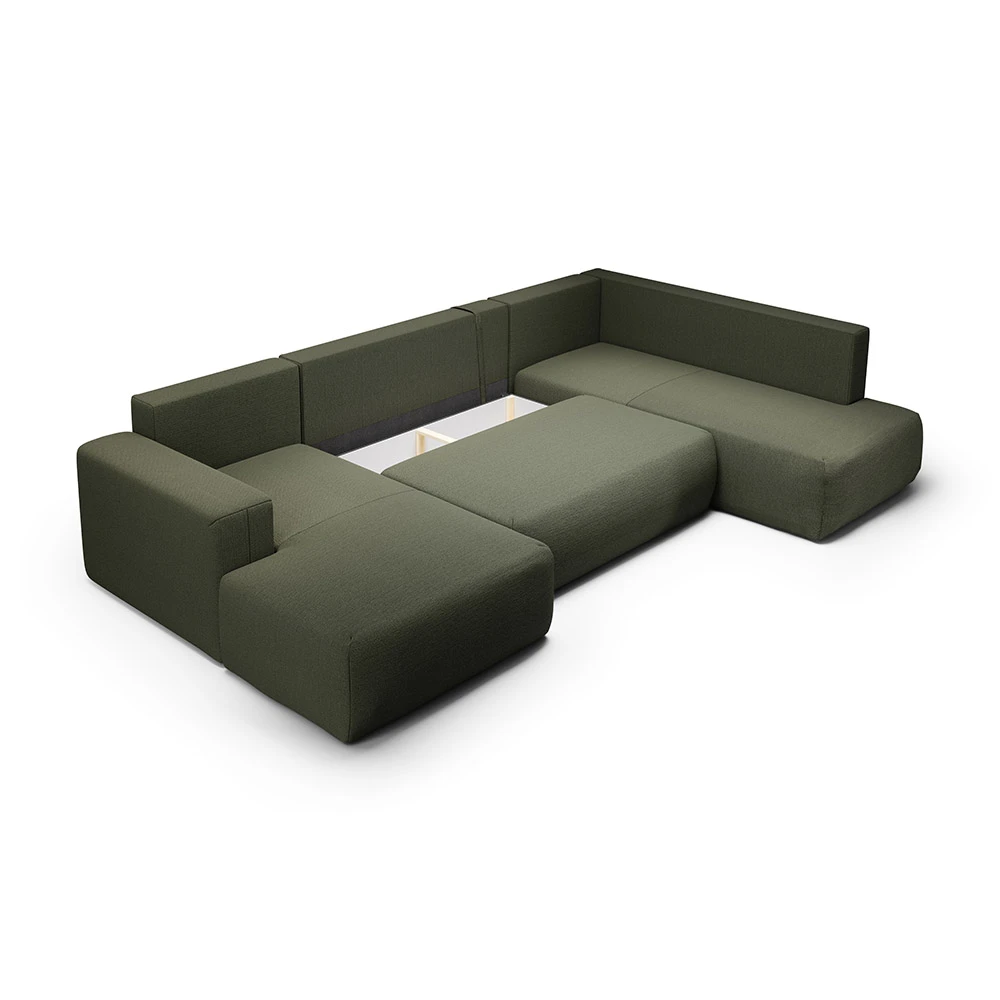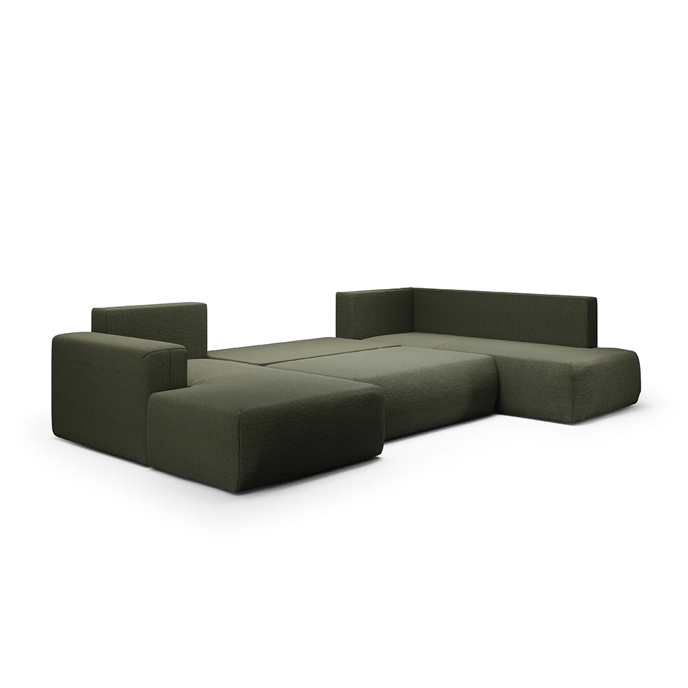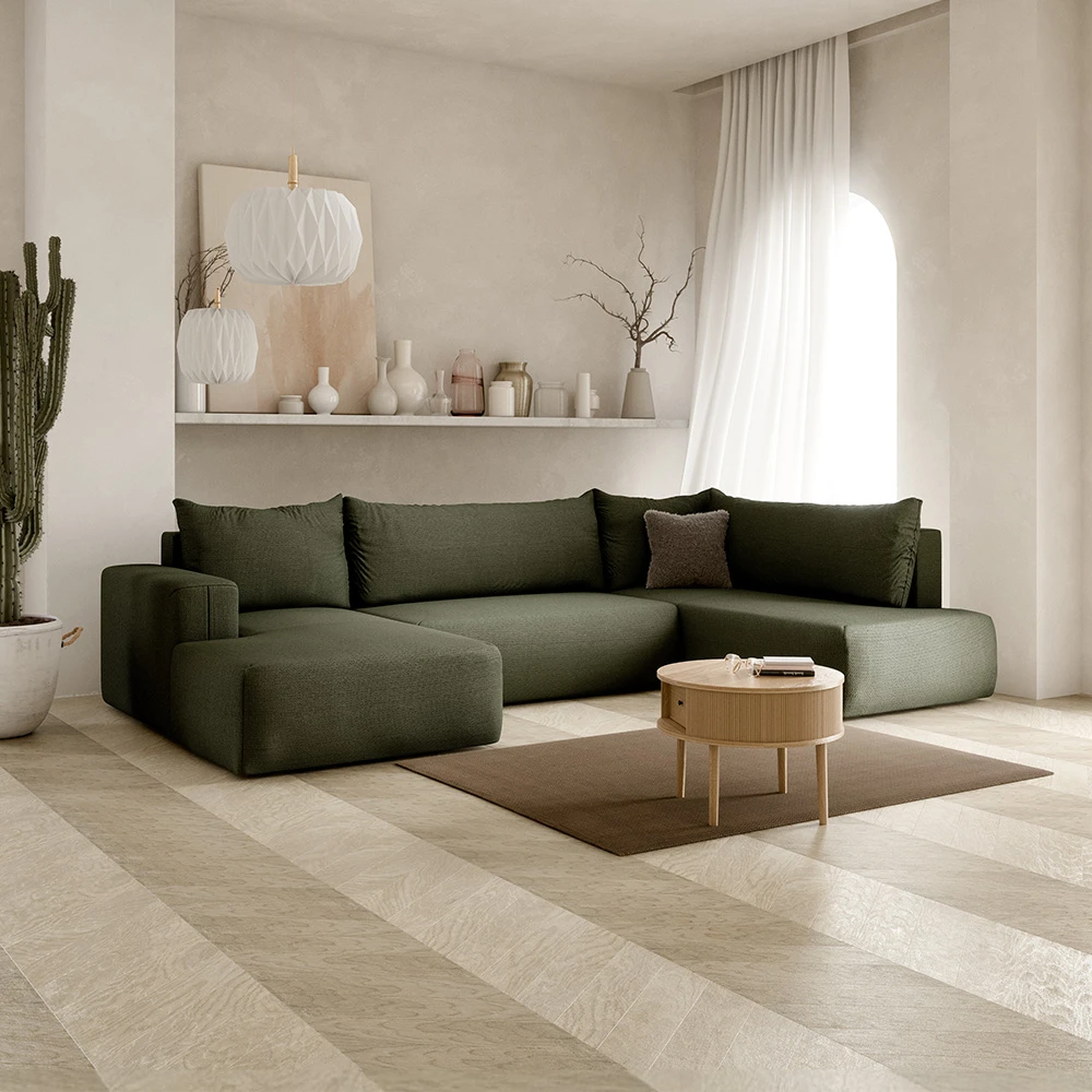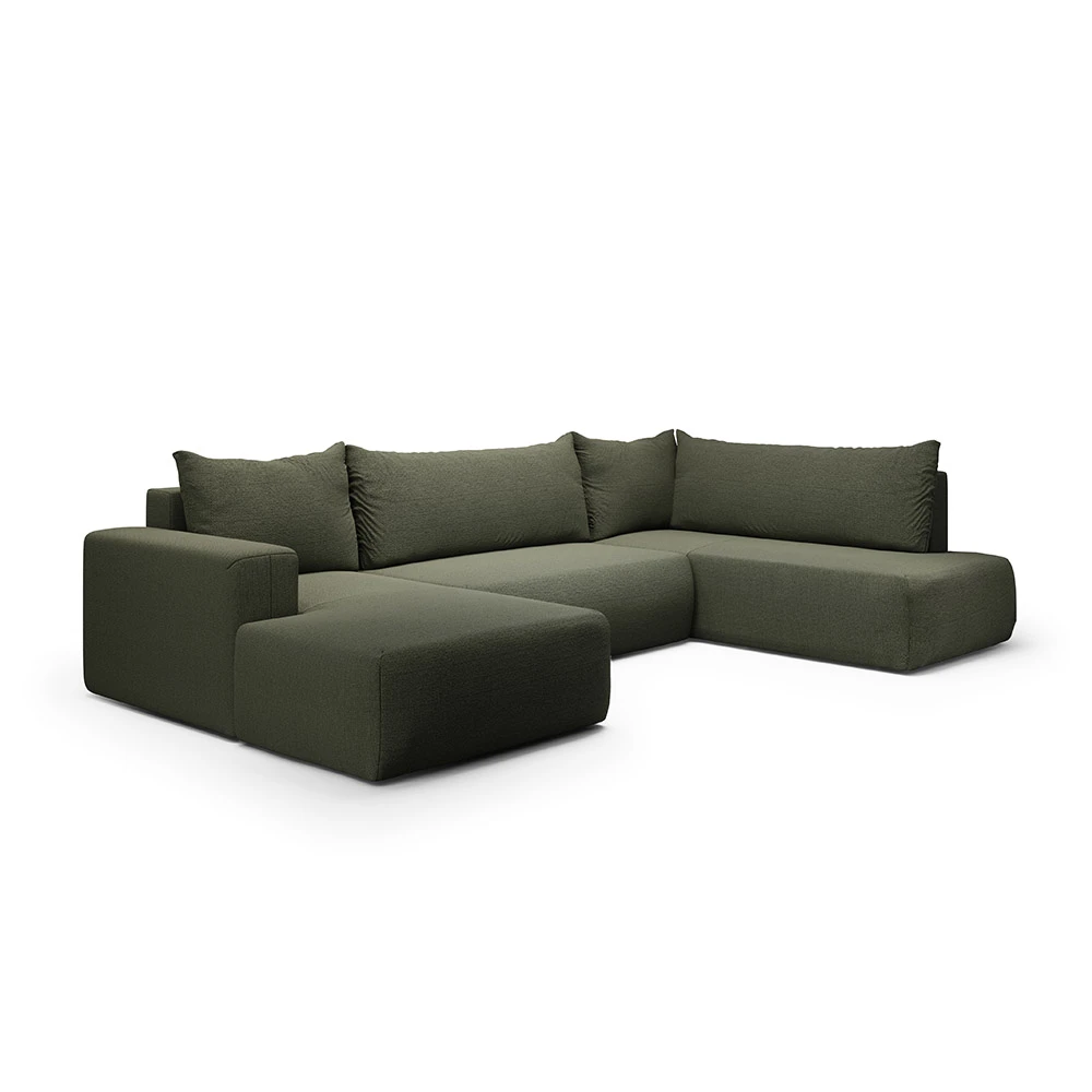 Canapé panoramique droit en tissu kaki: design moderne et confort enveloppant pour un salon élégant.