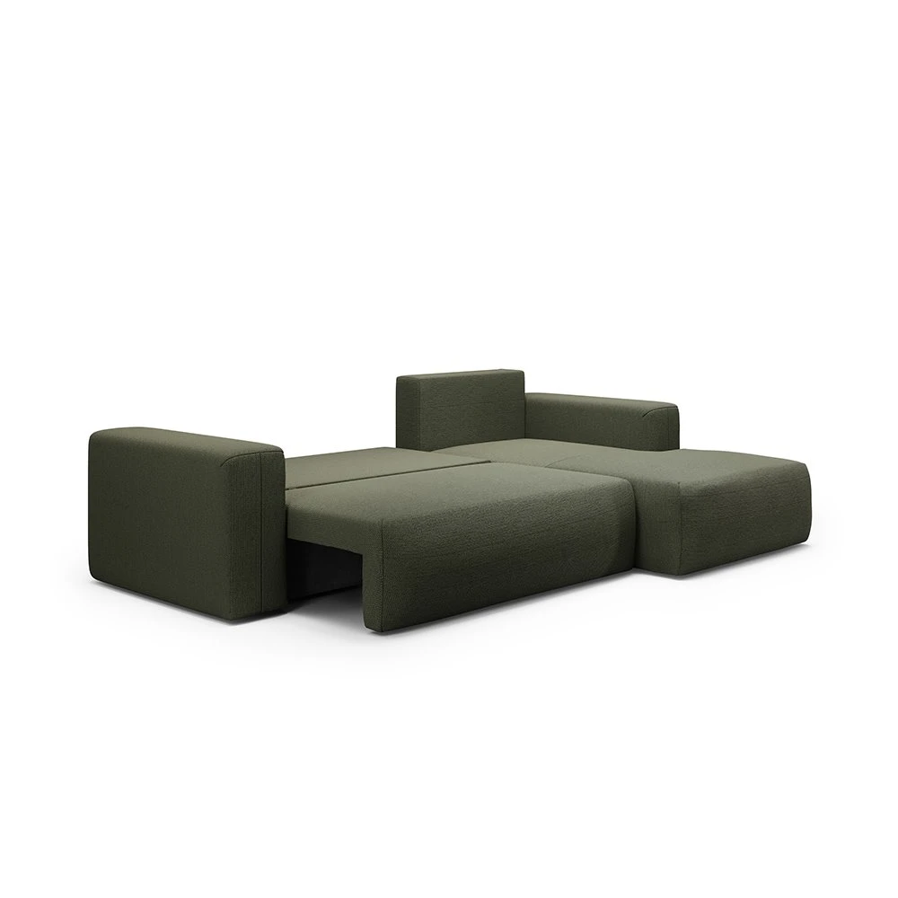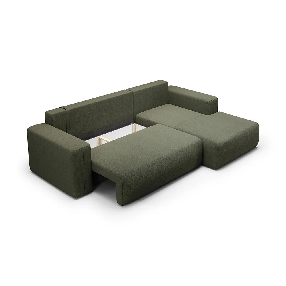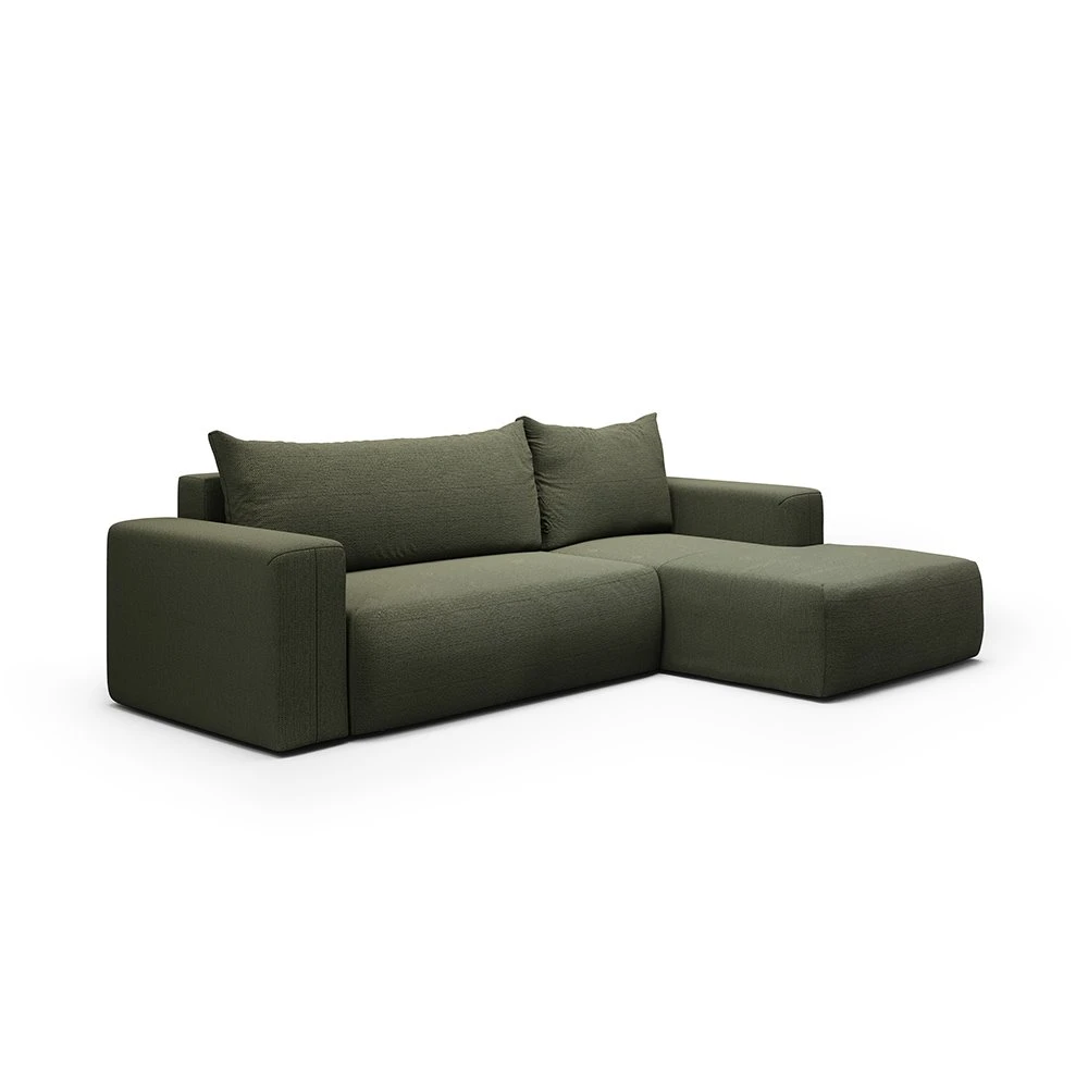 Canapé d'angle en tissu vert kaki, alliant design épuré, méridienne modulable et confort optimal, parfait pour tous les intérieurs.