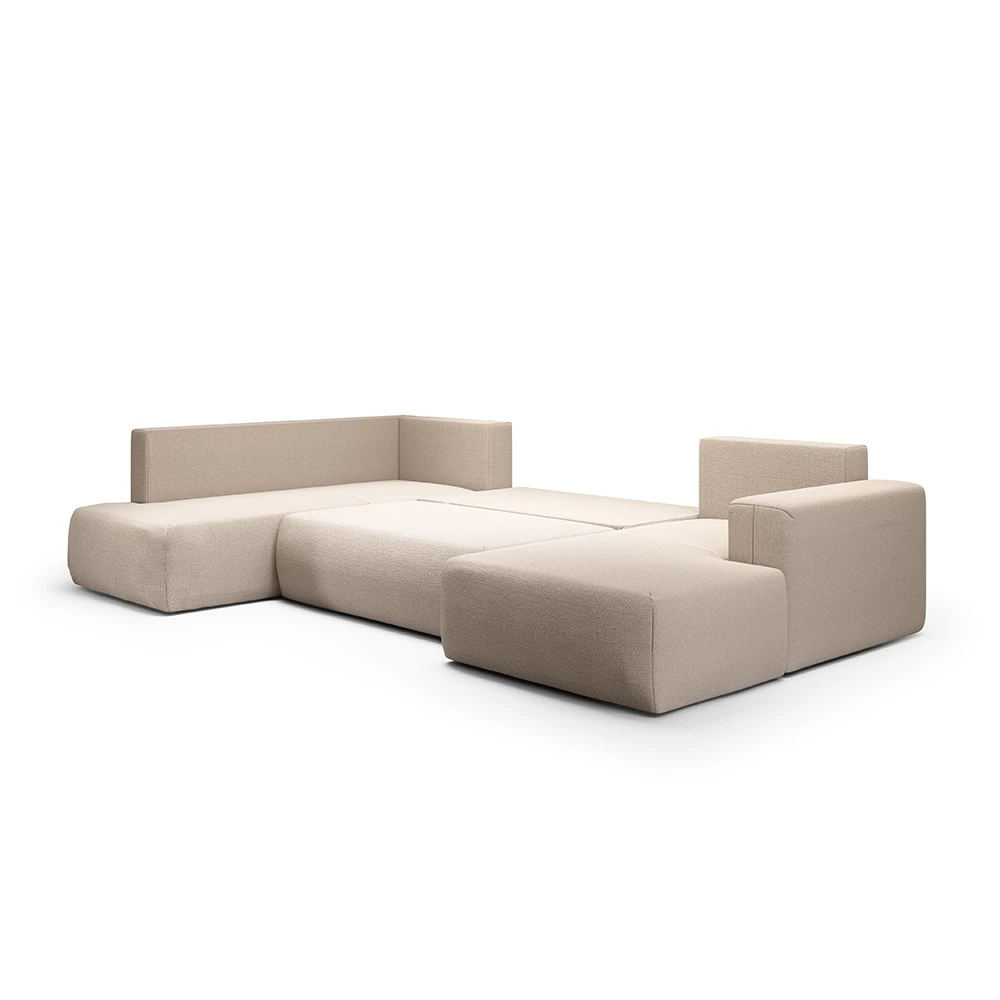 Canapé panoramique angle gauche en tissu beige : design moderne et confort enveloppant pour un salon élégant.
