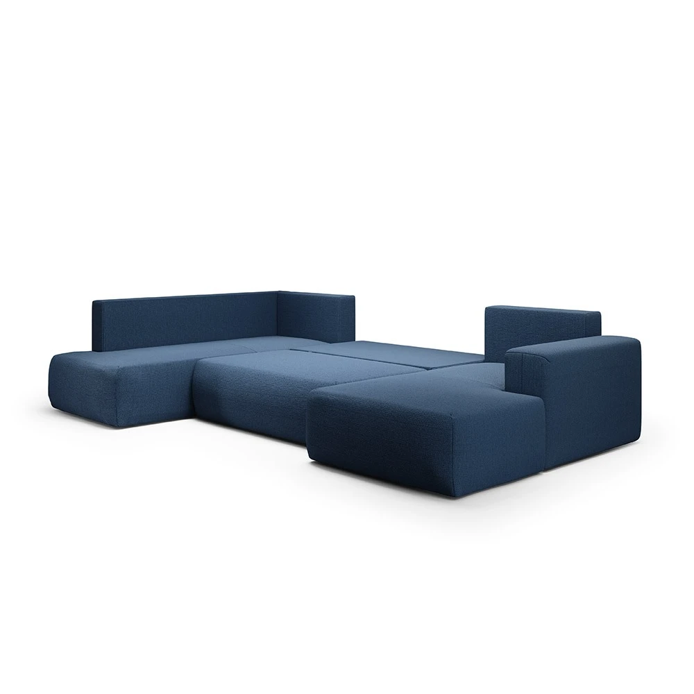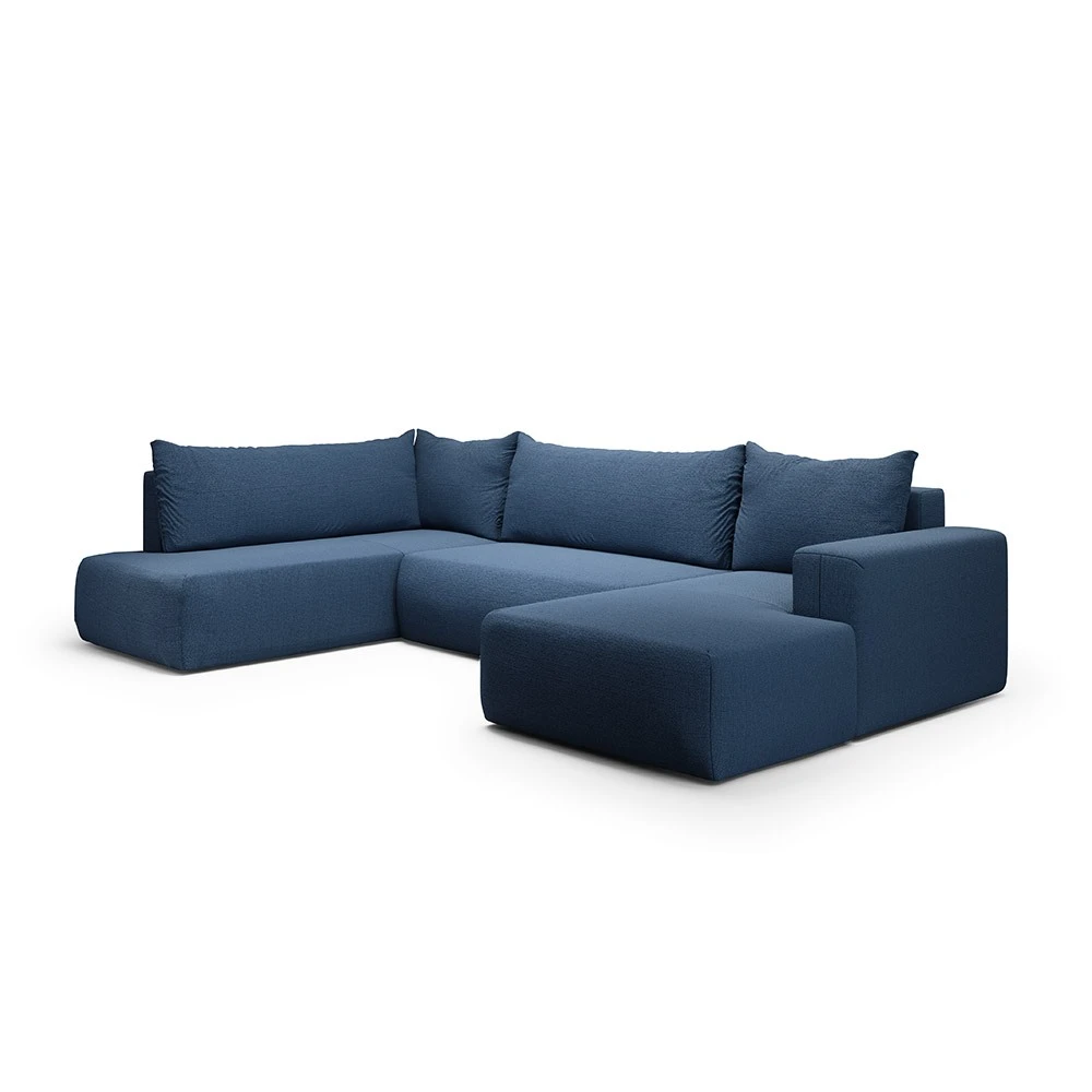 Canapé panoramique angle gauche en tissu bleu foncé: design moderne et confort enveloppant pour un salon élégant.