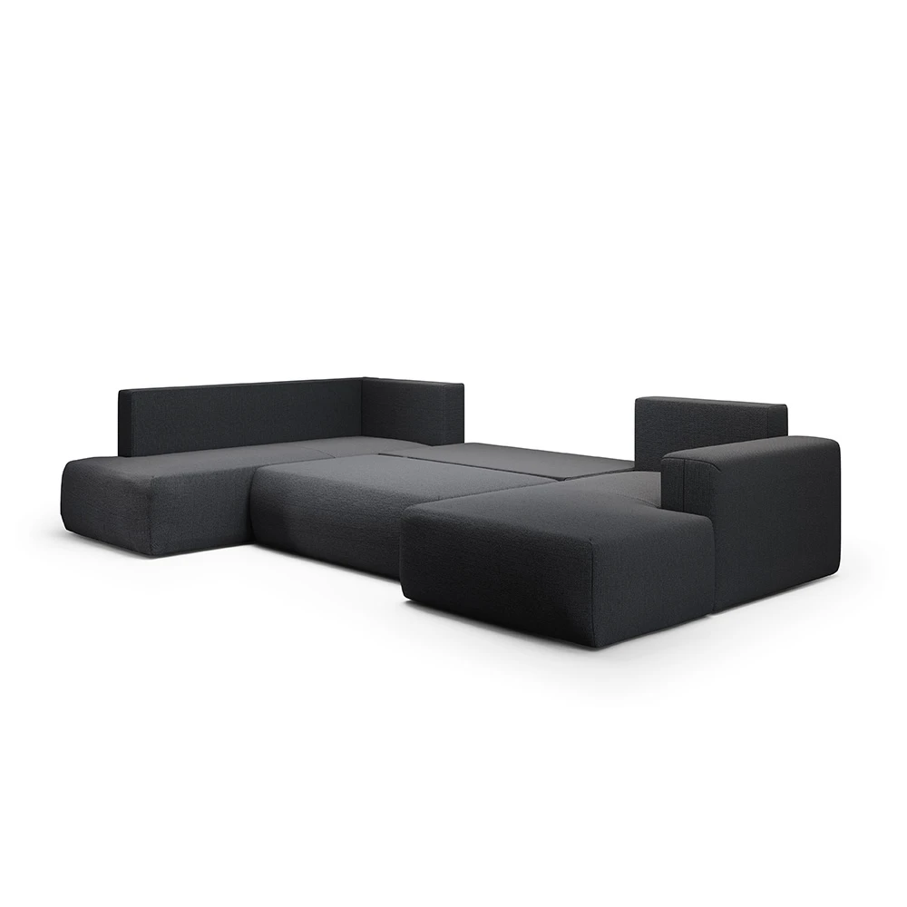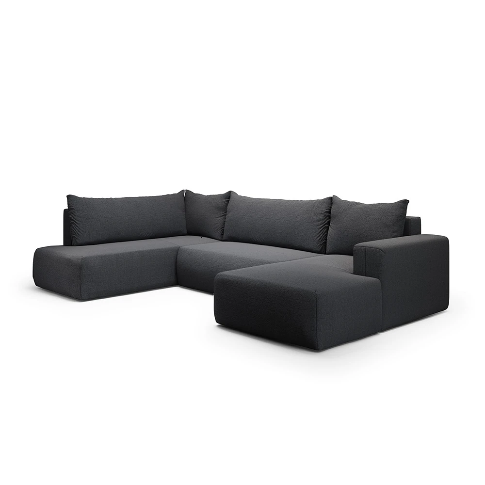 Canapé panoramique angle gauche en tissu gris foncé : design moderne et confort enveloppant pour un salon élégant.