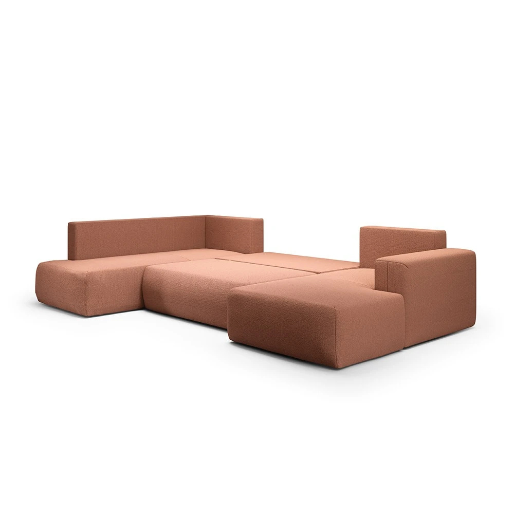 Canapé panoramique angle gauche en tissu orange : design moderne et confort enveloppant pour un salon élégant.