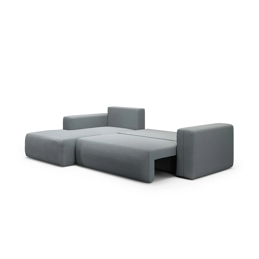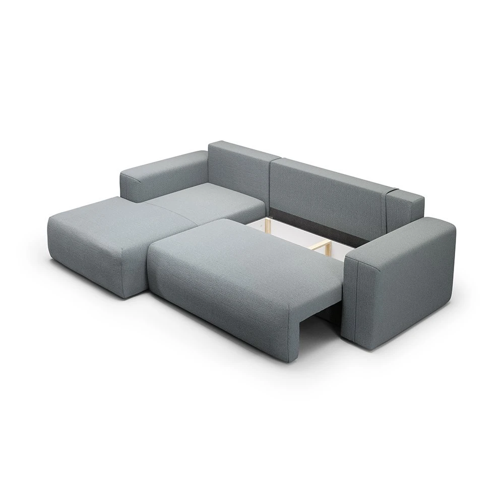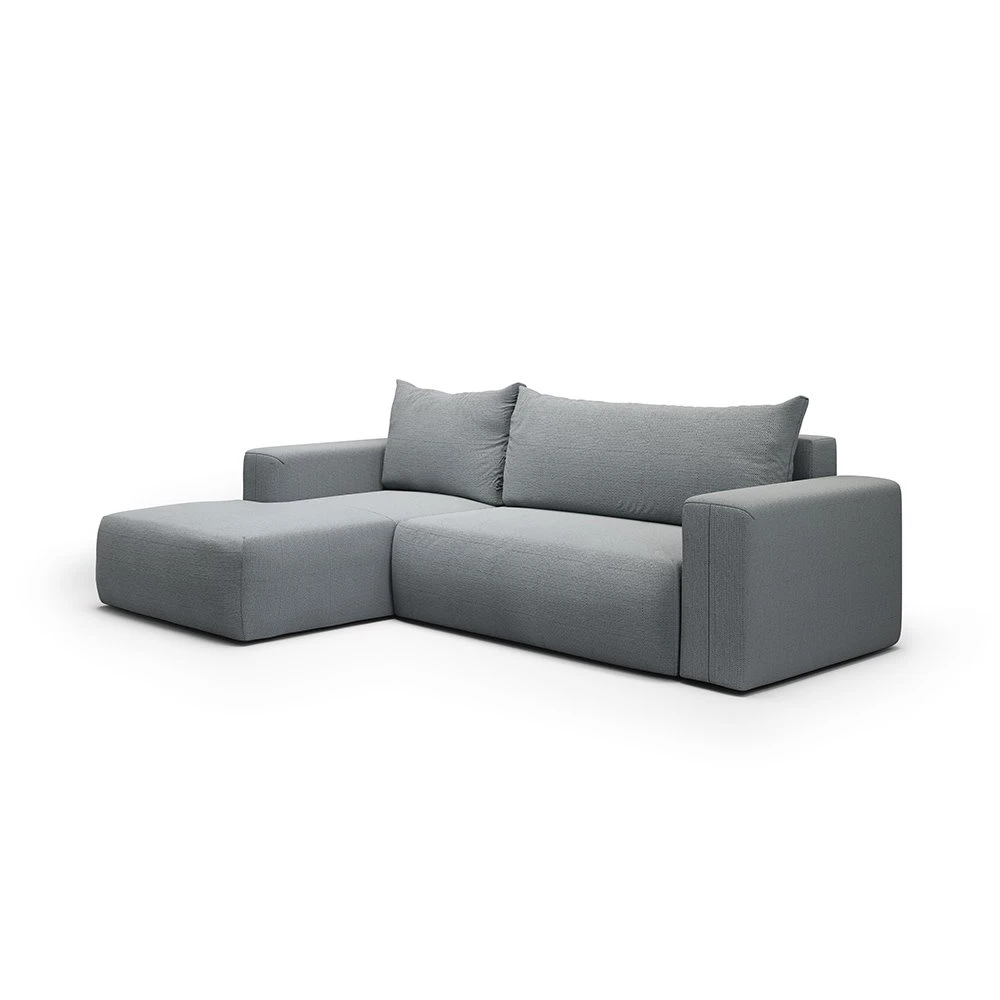 Canapé d'angle gauche en tissu gris clair alliant design épuré, méridienne modulable et confort optimal, parfait pour tous les intérieurs.