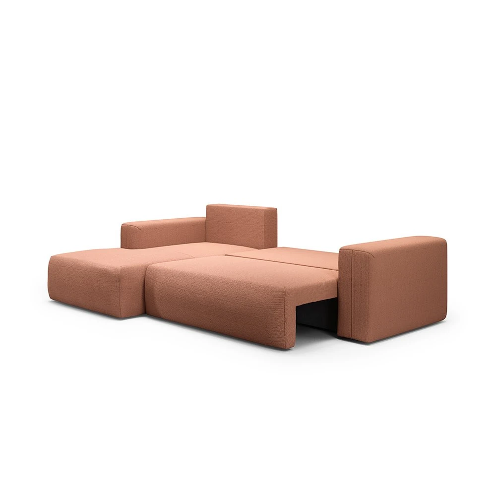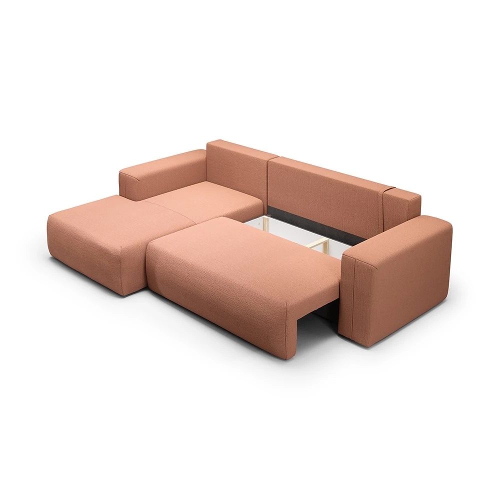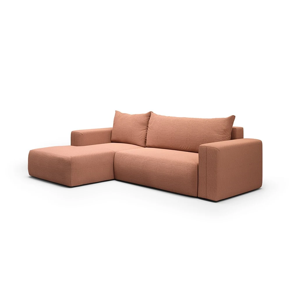Canapé d'angle gauche en tissu orange alliant design épuré, méridienne modulable et confort optimal, parfait pour tous les intérieurs.