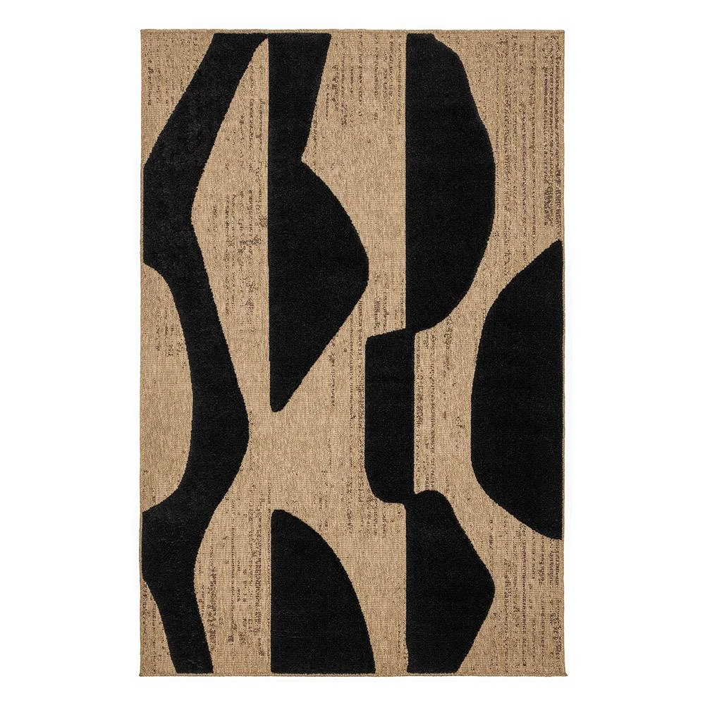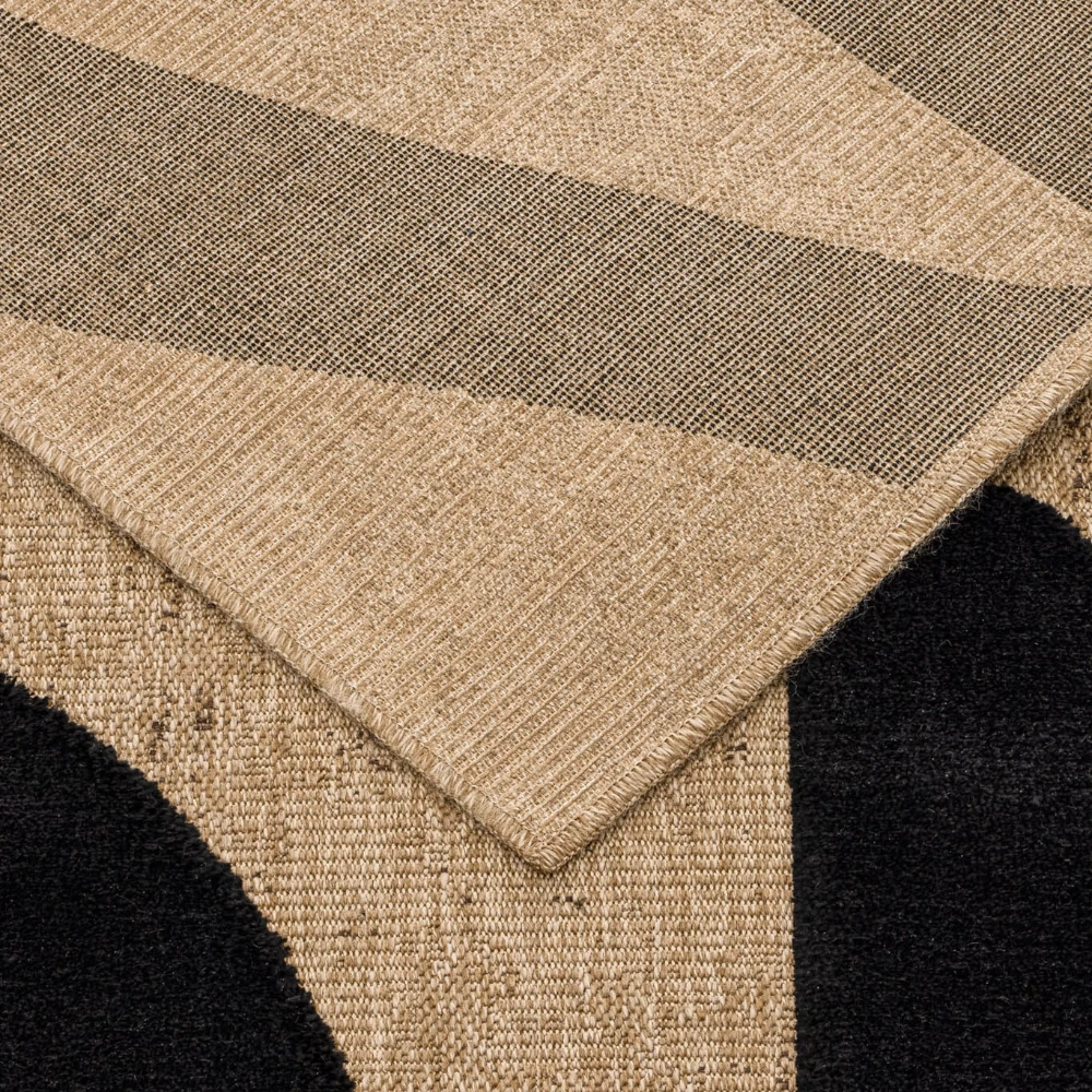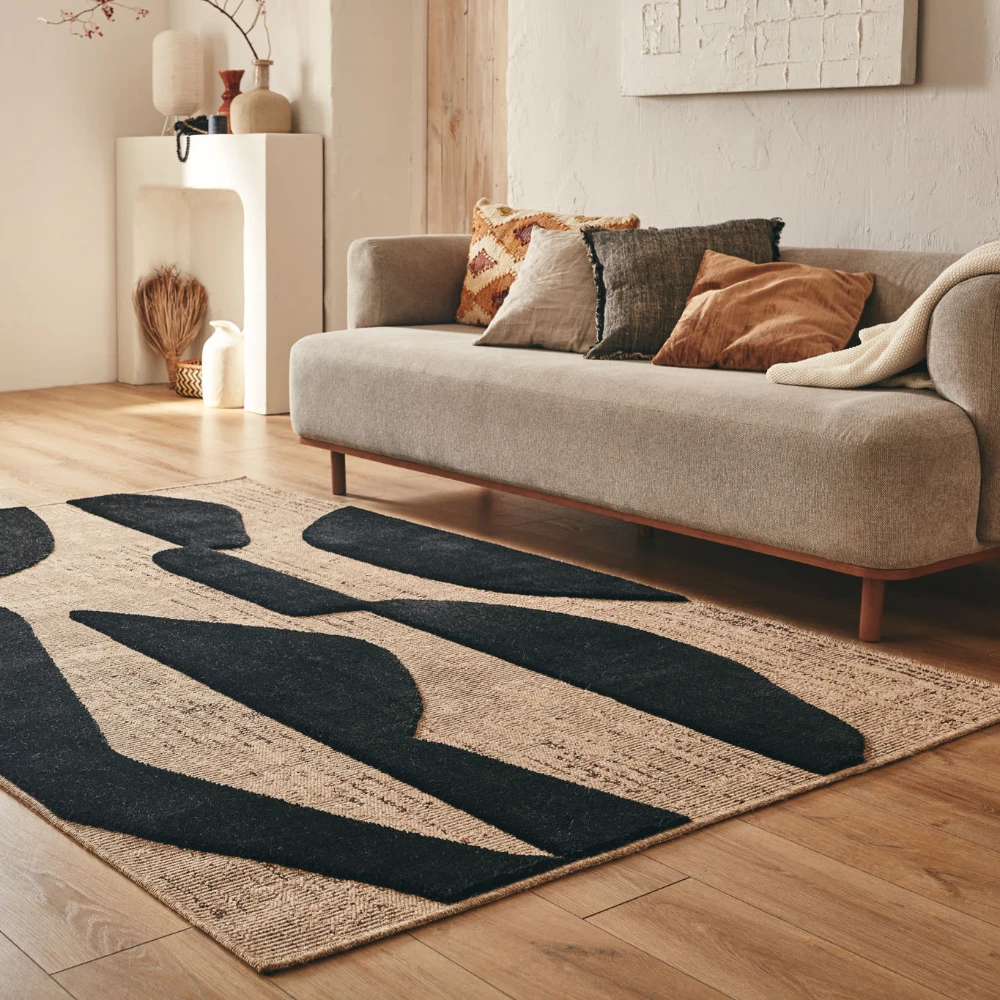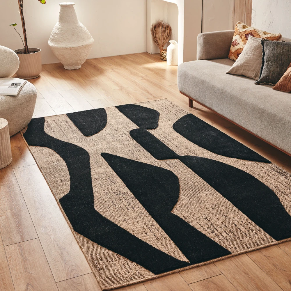 Tapis naturel avec motif en relief noir. Son design à motifs noirs ajoute une touche accrocheuse à n'importe quelle pièce, tandis que ses fibres naturelles offrent une surface durable et confortable.