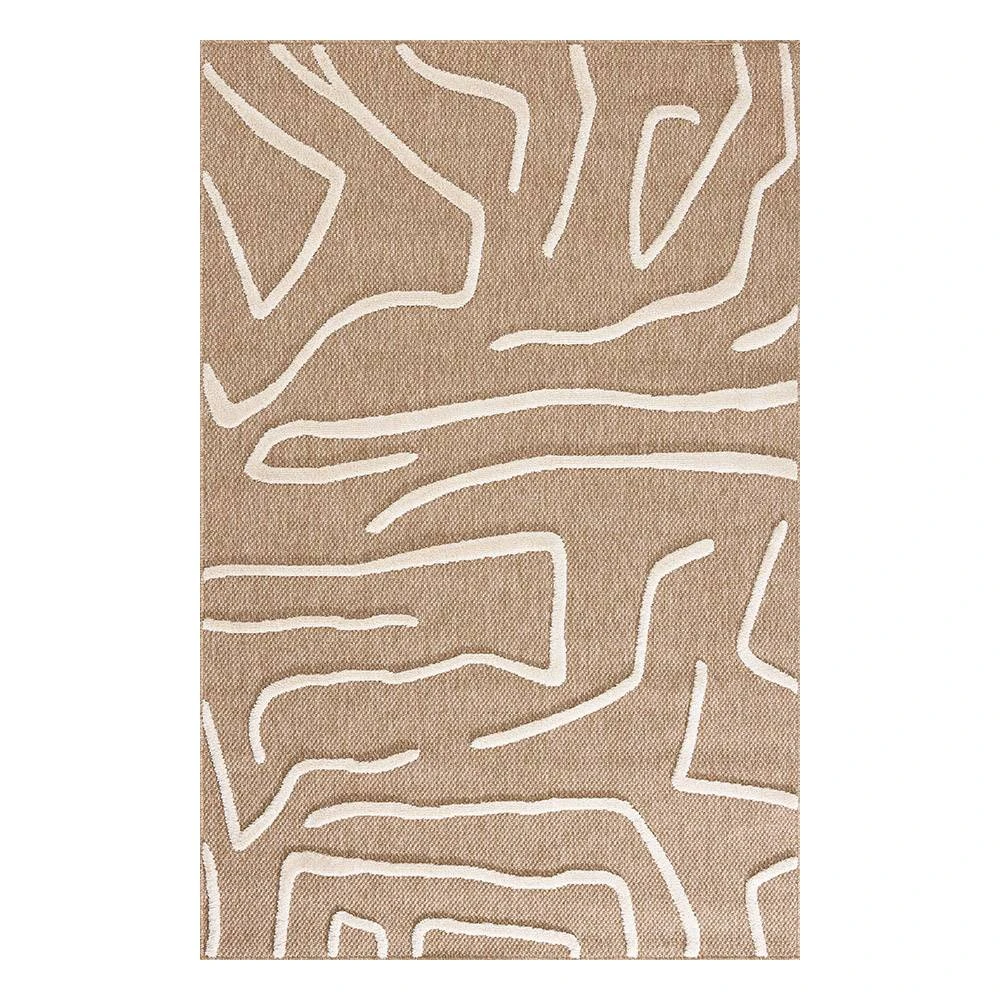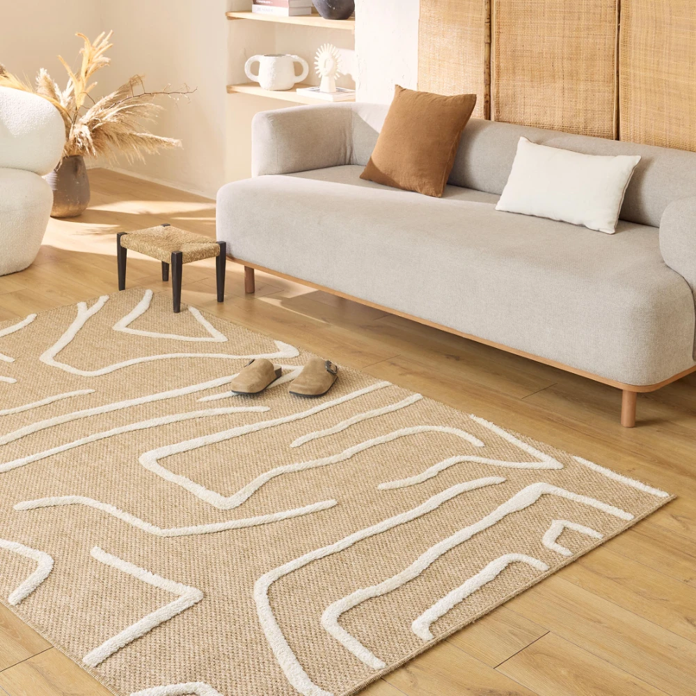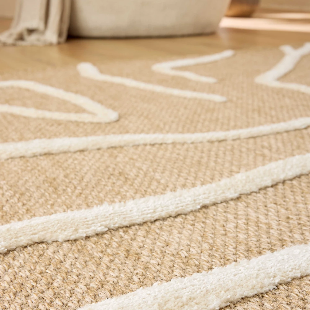 Tapis naturel avec motif géométrique en relief blanc. Son design à motif blanc ajoute une touche accrocheuse à n'importe quelle pièce, tandis que ses fibres naturelles offrent une surface durable et confortable.