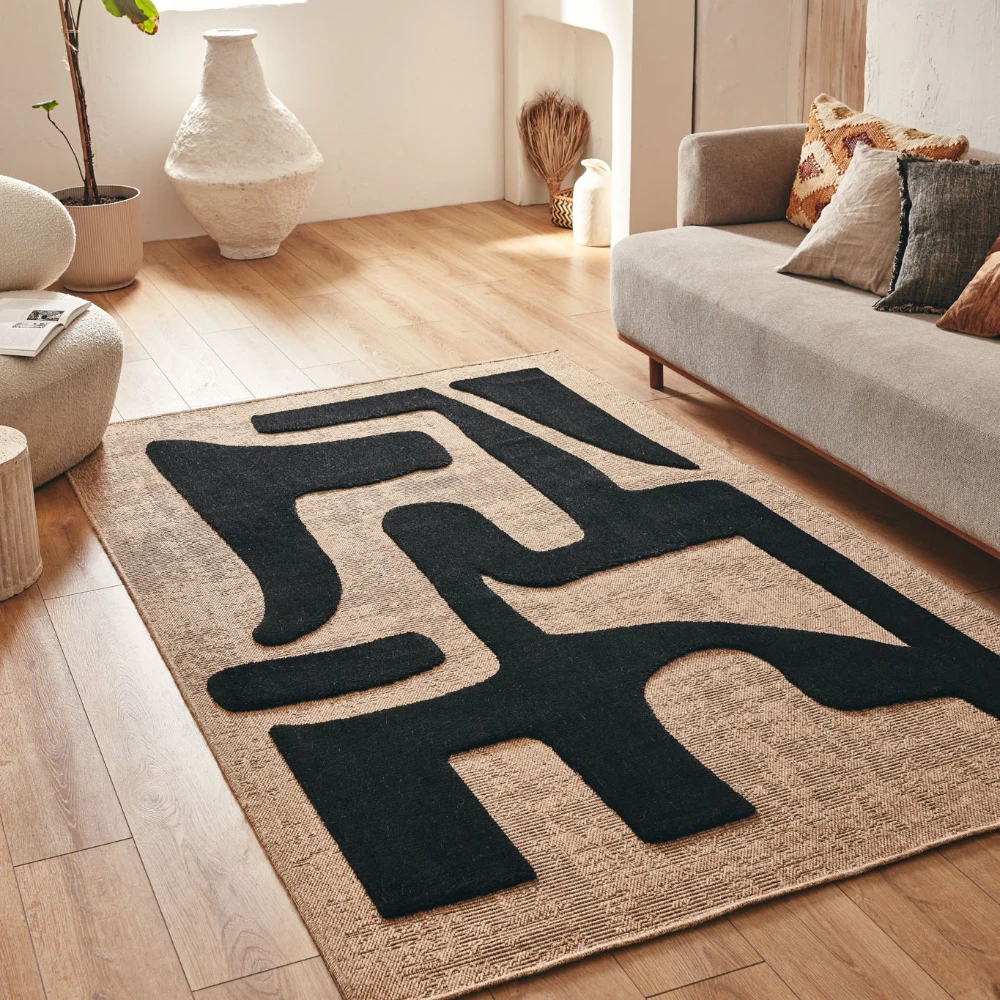 Tapis rustique avec motif en relief noir. Un tapis traditionnel avec un motif complexe de couleur noir ajoutant de la texture et de l'attrait à n'importe quelle pièce.