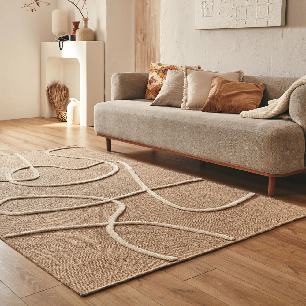 Tapis naturel avec motif géométrique en relief blanc. Son design à motif blanc ajoute une touche accrocheuse à n'importe quelle pièce, tandis que ses fibres naturelles offrent une surface durable et confortable.