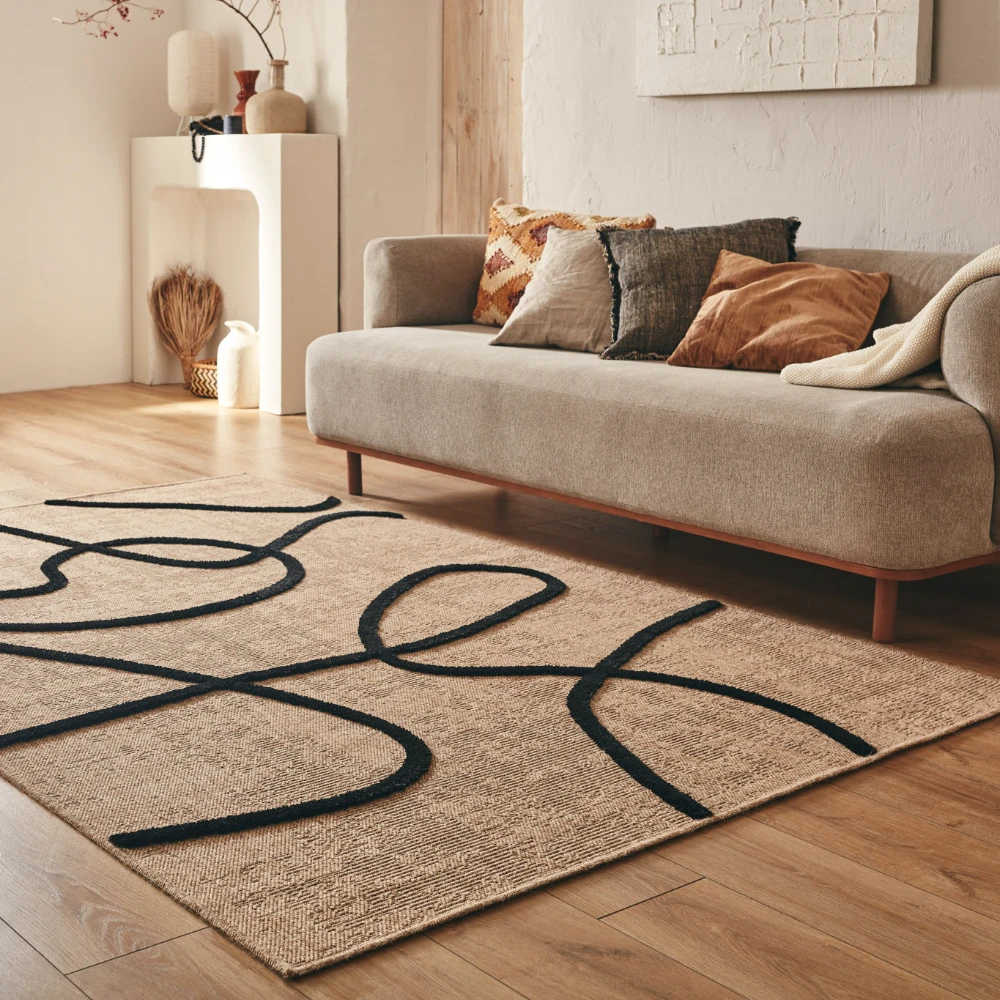 Tapis naturel avec motif géométrique en relief noir. Son design à motifs noirs ajoute une touche accrocheuse à n'importe quelle pièce, tandis que ses fibres naturelles offrent une surface durable et confortable.