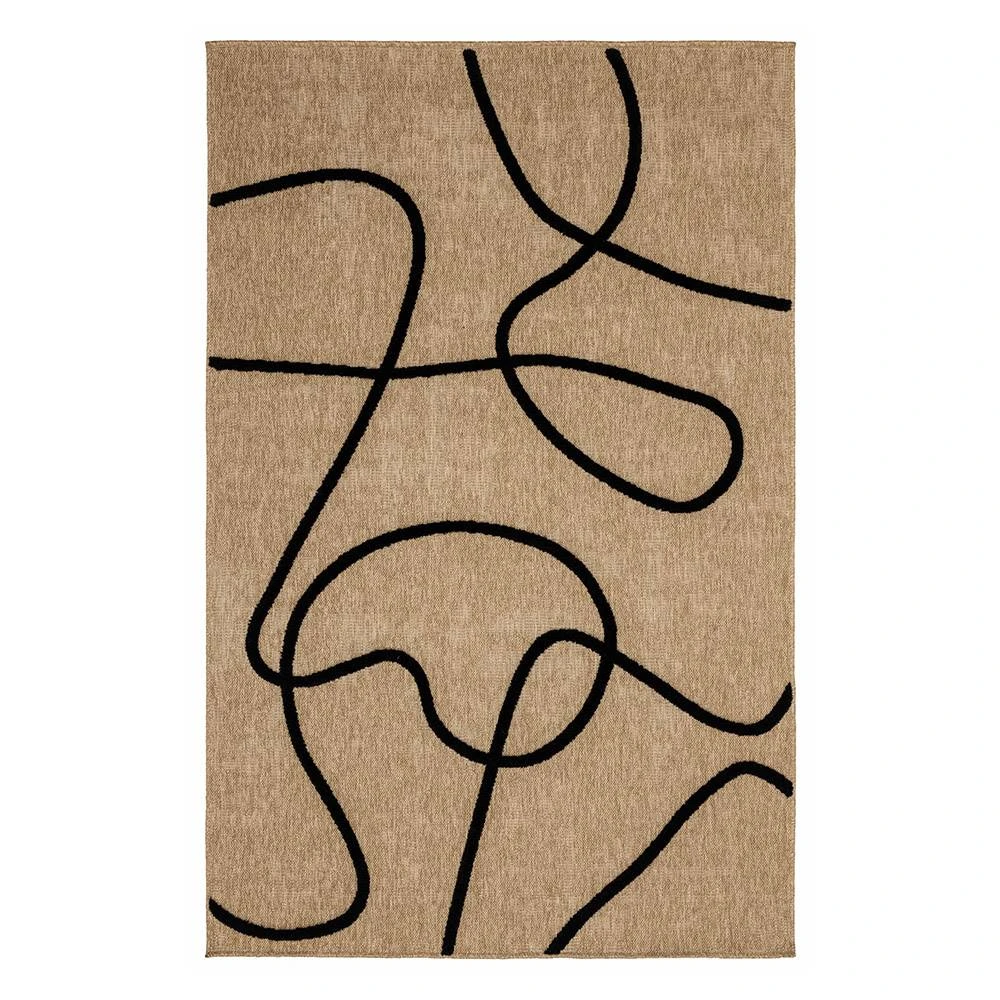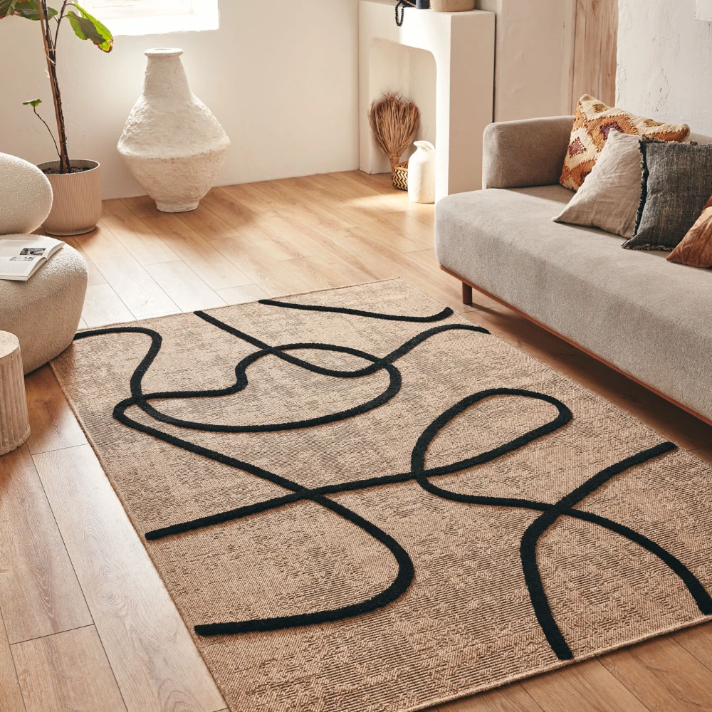Tapis naturel avec motif géométrique en relief noir. Son design à motifs noirs ajoute une touche accrocheuse à n'importe quelle pièce, tandis que ses fibres naturelles offrent une surface durable et confortable.