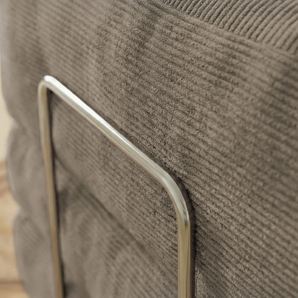 Un détail métallique subtil sur le côté ajoute une touche design, renforçant l’esthétique épurée de la pièce. Son allure moelleuse et enveloppante en fait un véritable cocon au quotidien.