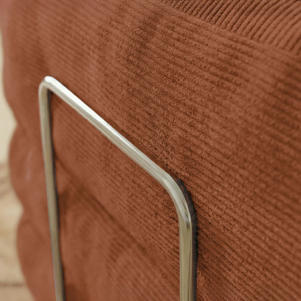 Un détail métallique subtil sur le côté ajoute une touche design, renforçant l’esthétique épurée de la pièce. Son allure moelleuse et enveloppante en fait un véritable cocon au quotidien.