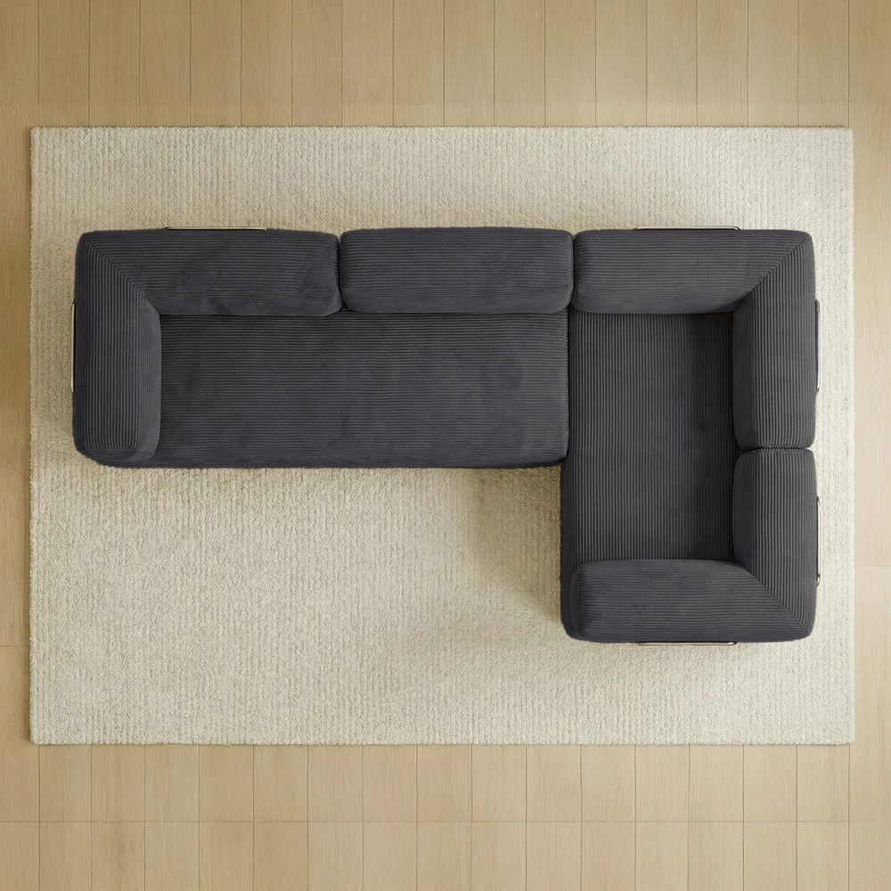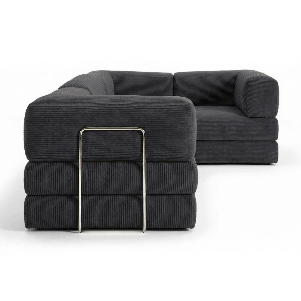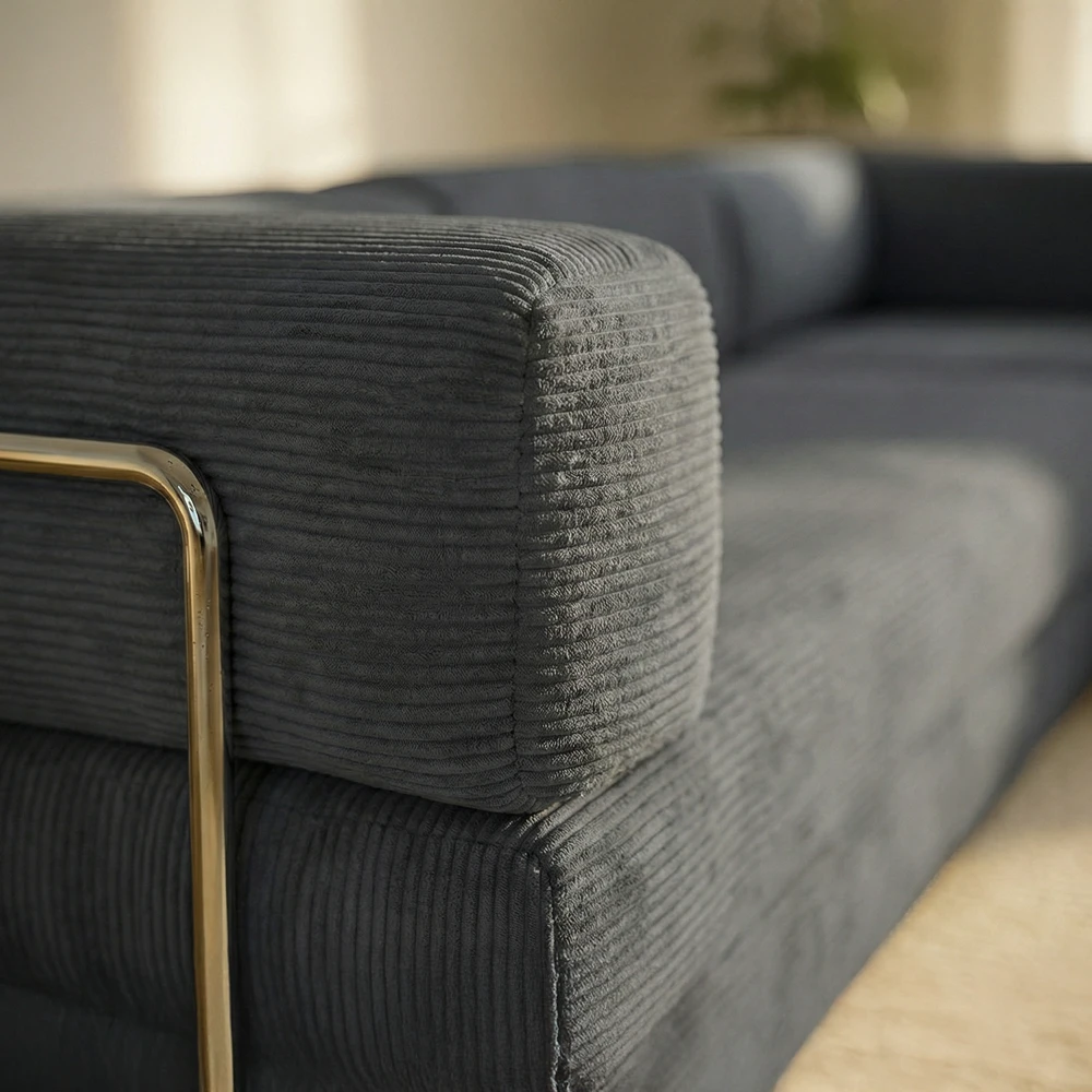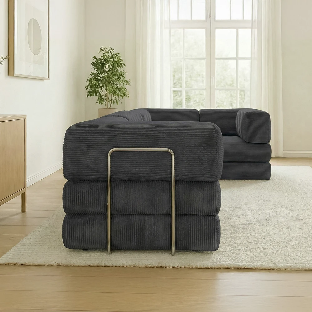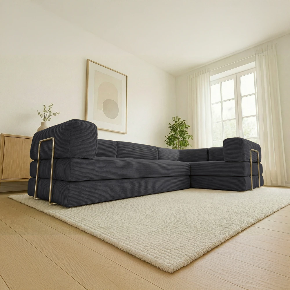 Le design est rehaussé par une structure métallique visible sur les accoudoirs, apportant une touche graphique discrète et moderne. Fonctionnel et esthétique, ce canapé d’angle devient également un couchage d’appoint confortable, parfait pour les intérieurs à la recherche de modularité.